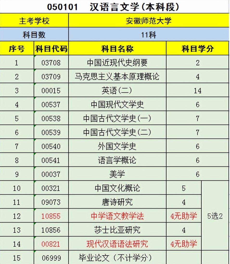 我们通过上述对汉语言文学专业的简单介绍以及就业形势分析,下面我们来看一看这个专业的自考本科都需要考哪些科目,为了方便大家查看,专门做了一张图展示给大家看。