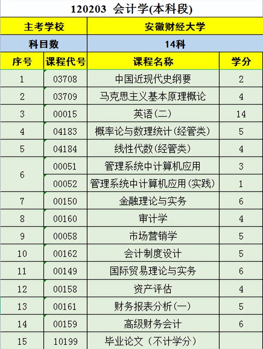 那么在安徽,会计学自考本科需要考哪些科目呢,我们还是以一张图片形式展示给大家看一下。
